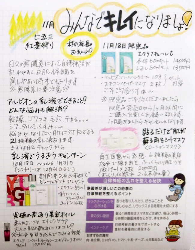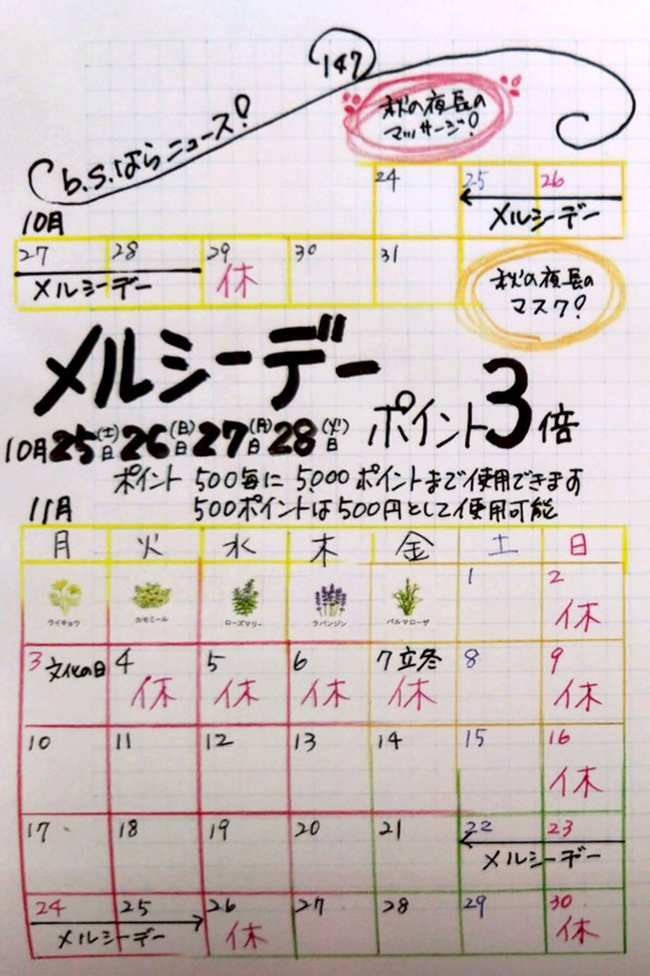 11月2日(日)・4日(火)~7日(金)・9日(日)・16日(日)・26日(水)・30日(日)は店休日となります。